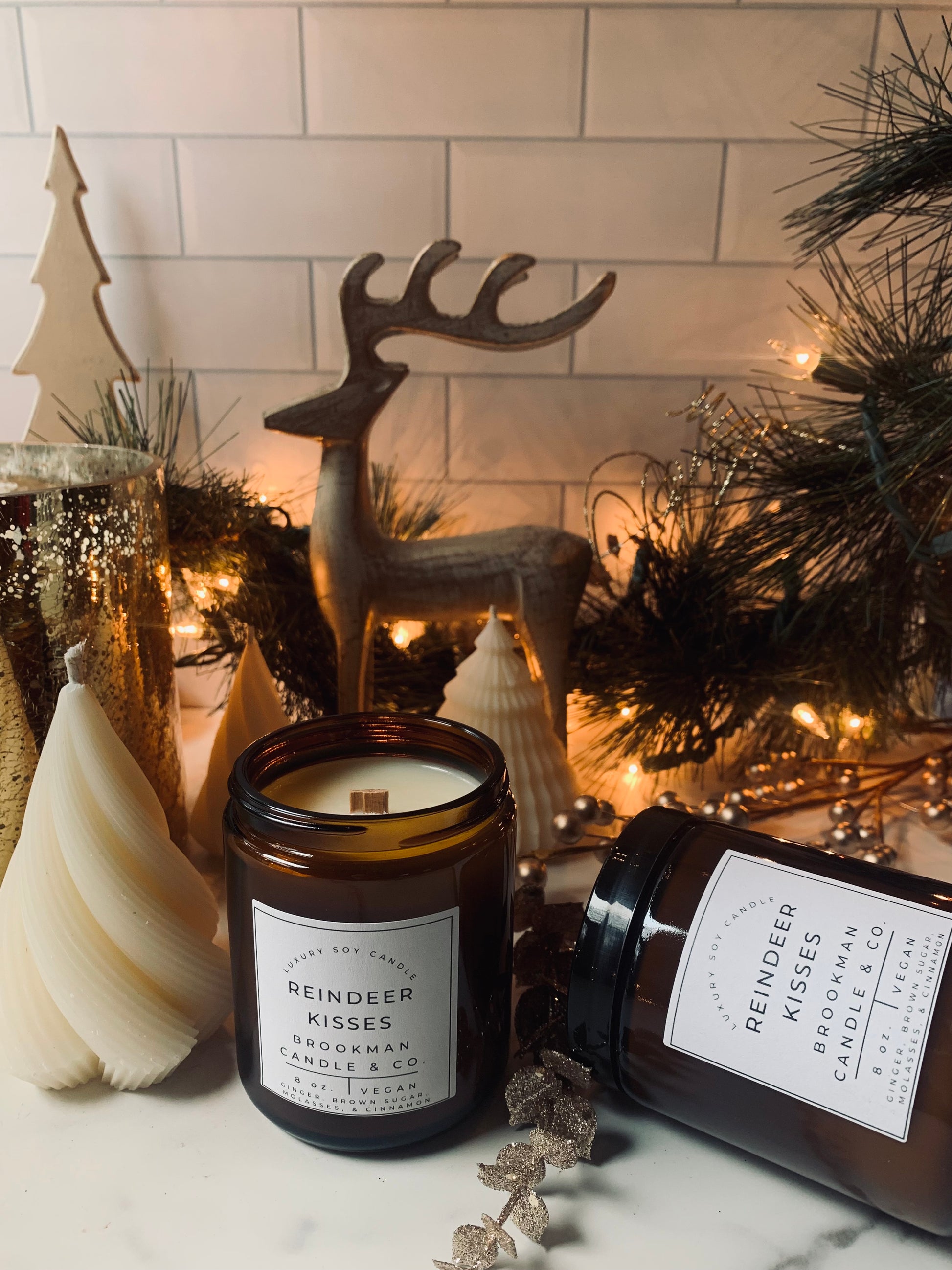 Have you ever wondered what a Reindeer Kiss may be like? Well here at Brookman Candle, we imagine it to be nothing short of magical. Wrap your arms around one of Santa's fellow fliers and you will be welcomed with warm butter, molasses, sweet cream and spiced ginger Reindeer Kisses.