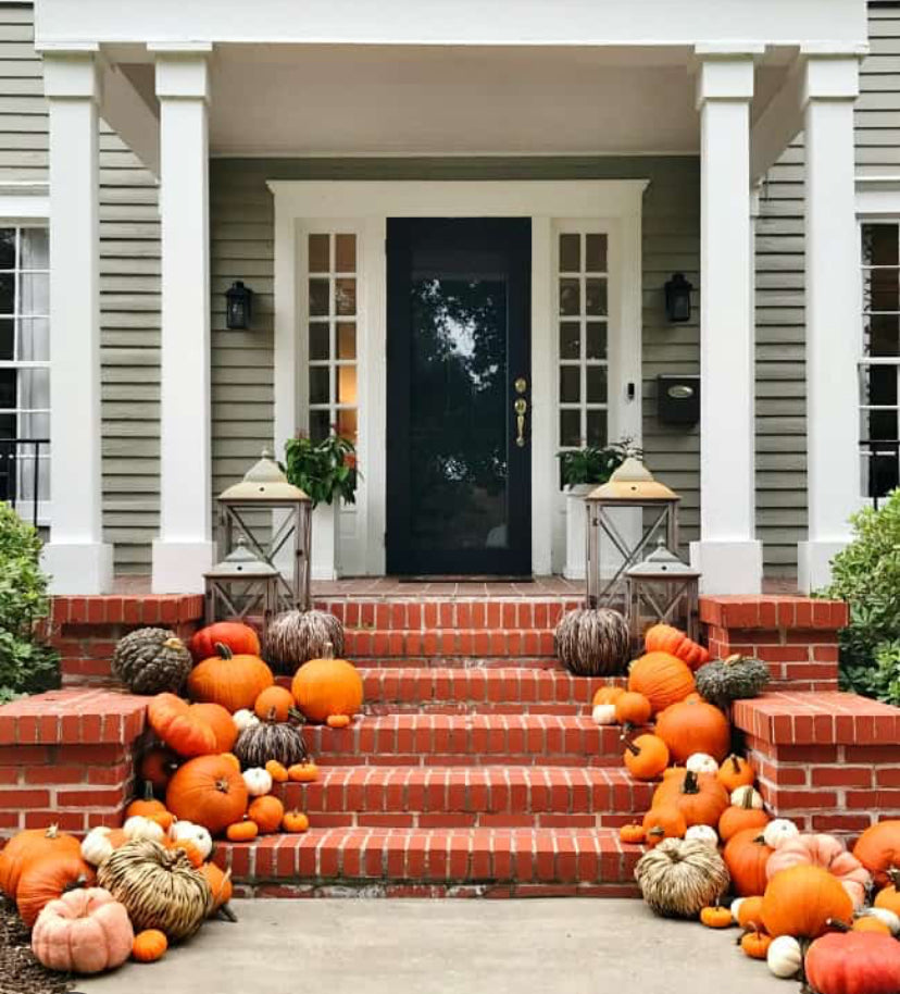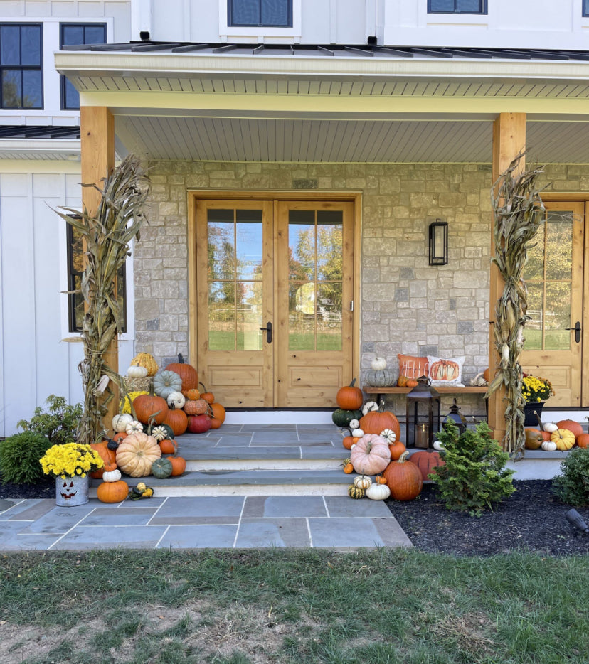 A large, eye-catching display with layered pumpkins, gourds, greenery, and rustic touches—designed to wow. Can be divided up to make 2-3 pumpkin clusters at your entryway.